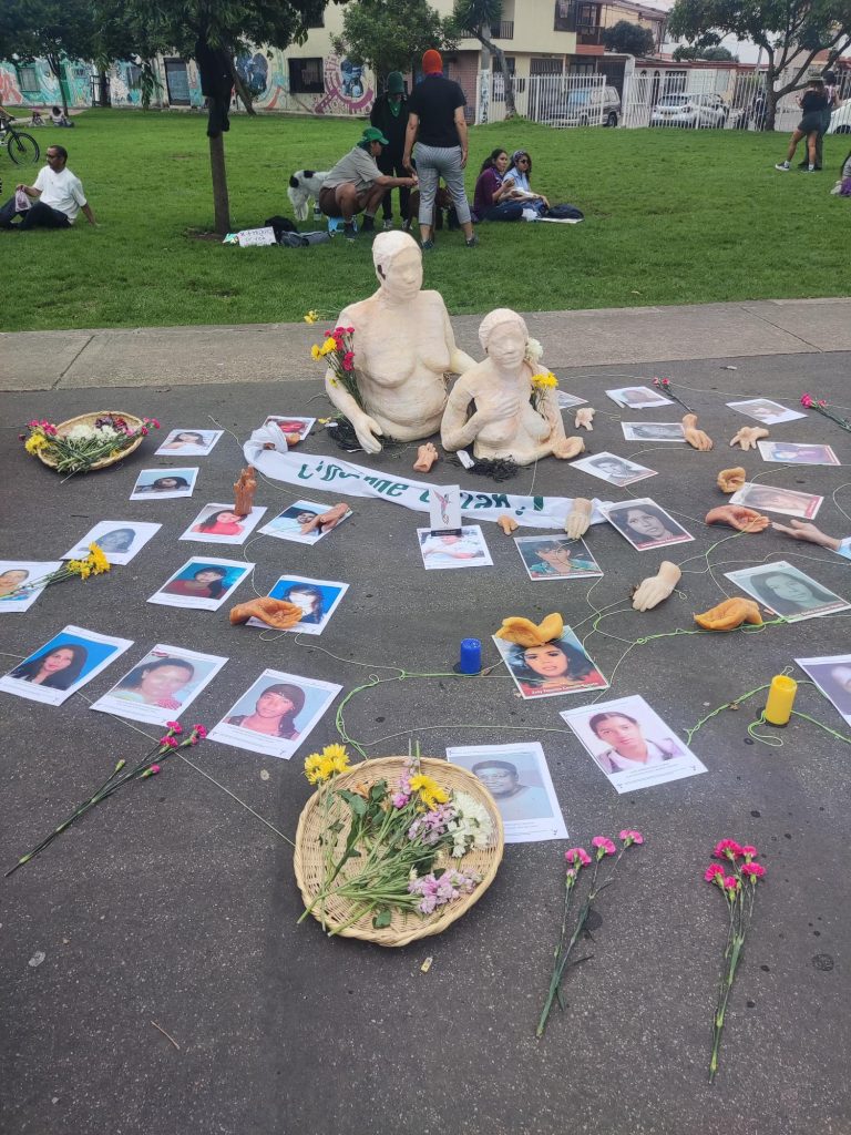 En el suelo, los rostros de mujeres impresos en hojas forman un círculo alrededor de una escultura femenina. Flores, velas y objetos cotidianos convierten el espacio público en un altar improvisado. La escena recuerda que la marcha nombra a quienes ya no están, víctimas de violencias que el Estado y la sociedad han sido incapaces de detener.