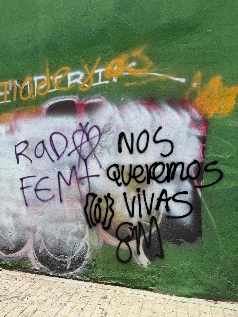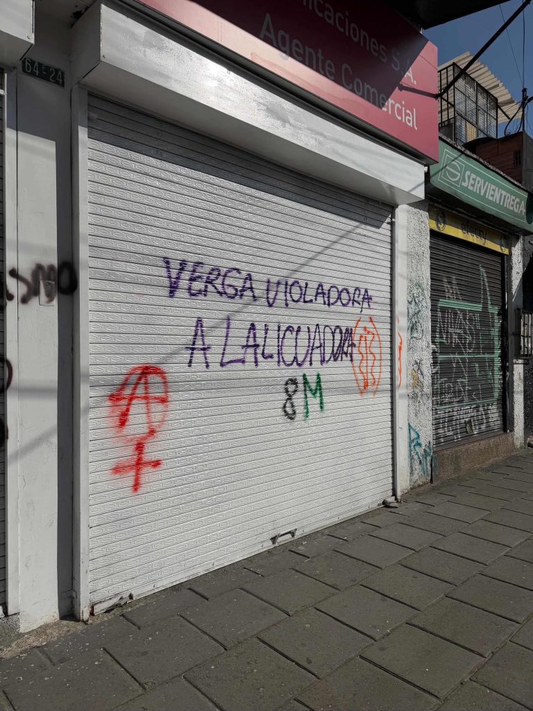 En una persiana metálica cerrada aparece pintada una frase directa: “Verga violadora a la licuadora”. El grafiti, repetido en distintas marchas feministas en América Latina, funciona como una forma de justicia simbólica. Frente a instituciones que muchas veces fallan en proteger a las mujeres, el muro se convierte en un espacio de denuncia.