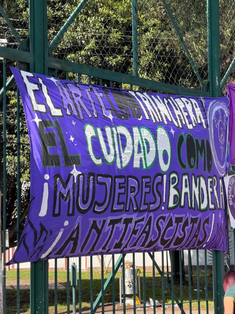Una gran tela morada cuelga de una reja. Su mensaje conecta las luchas feministas con otras resistencias contemporáneas, mientras se recuerda que el patriarcado no opera aislado, sino entrelazado con otras formas de poder y dominación.