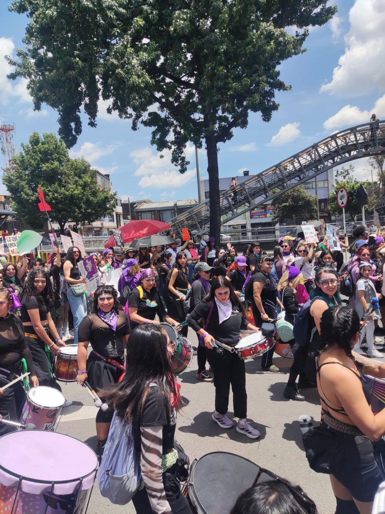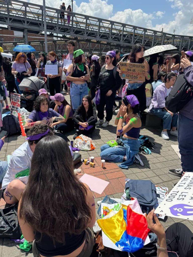 Desde cierta distancia, la escena adquiere otra dimensión: cuerpos, telas moradas, cantos que se superponen. La marcha avanza lentamente y, durante unos minutos, la calle deja de funcionar como un espacio de tránsito. Se convierte en un lugar donde la memoria se hace visible, la rabia se vuelve palabra y la solidaridad encuentra forma en el simple hecho de caminar juntas.